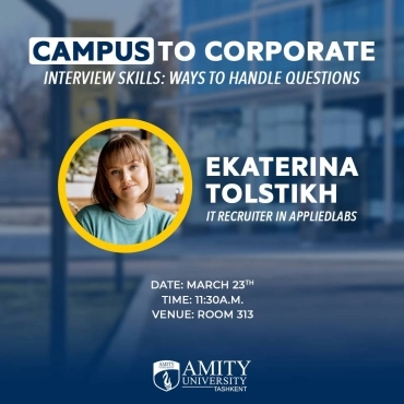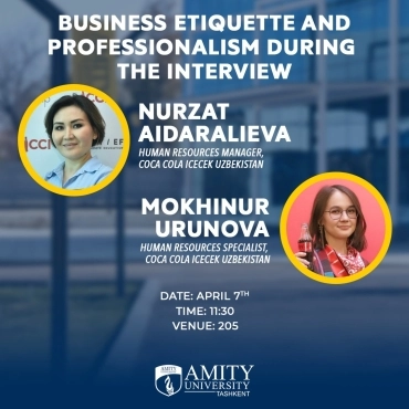 AUT is organizing a workshop on the topic of "Business Etiquette and Professionalism During the Interview" Speakers: Nurzat Aidaralieva and Mokhinur Urunova Human Resources Managers, Coca-Cola İçecek Uzbekistan The workshop will be led by experienced professionals in the field who will provide you with practical tips and advice.