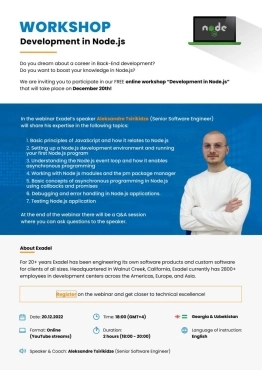 DetailDo you want to boost your knowledge in Node.js? We are inviting you to participate in our FREE online workshop “Development in Node.js” Date: 20.12.2022 Time: 19:00 (Tashkent Time) Format: Online (via YouTube stream) Duration: 2 hours (19:00 - 21:00) Language of instruction: English